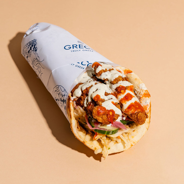 Crispy chicken pita with hot honey heat, cool crunch, and feta: made the Greek way.